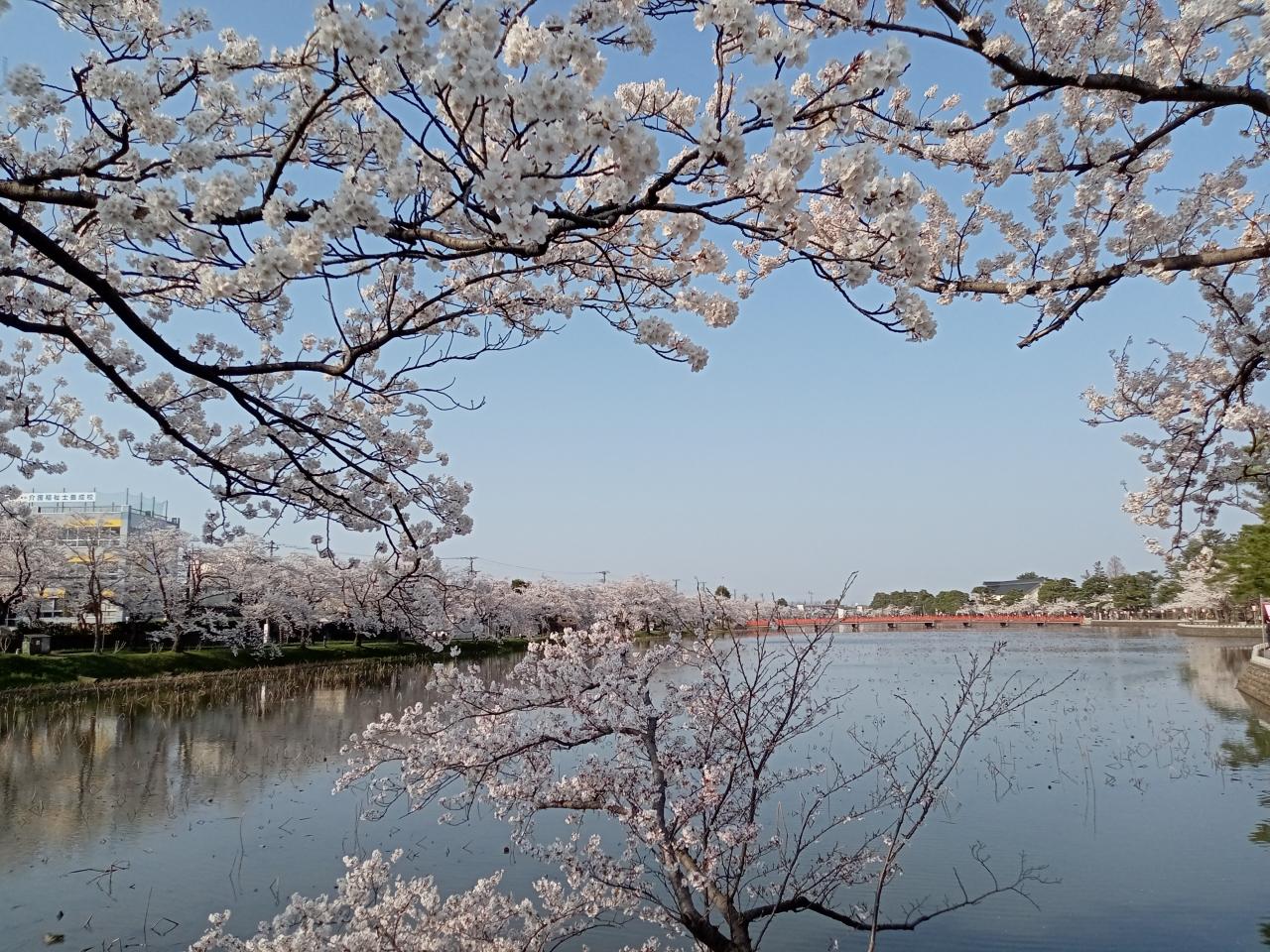先ほど歩いた桜並木です!よく見ると満開の桜が堀の水面に映し出されて美しいですね!