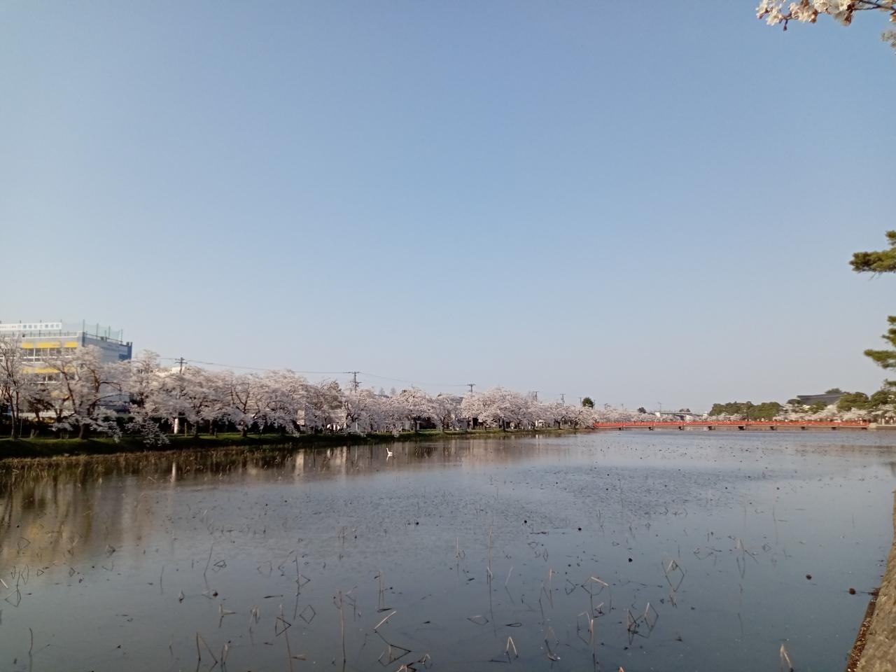 西堀橋の近くまで来ました。振り返ると、こちらは順光で堀の四方に美しい桜並木が見えます!まさに絶景です!