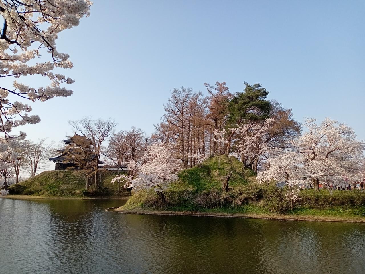 だいぶ櫓から離れた堀沿いのスポットでも、櫓と堀と満開の桜群は絶句するほど美しいです!