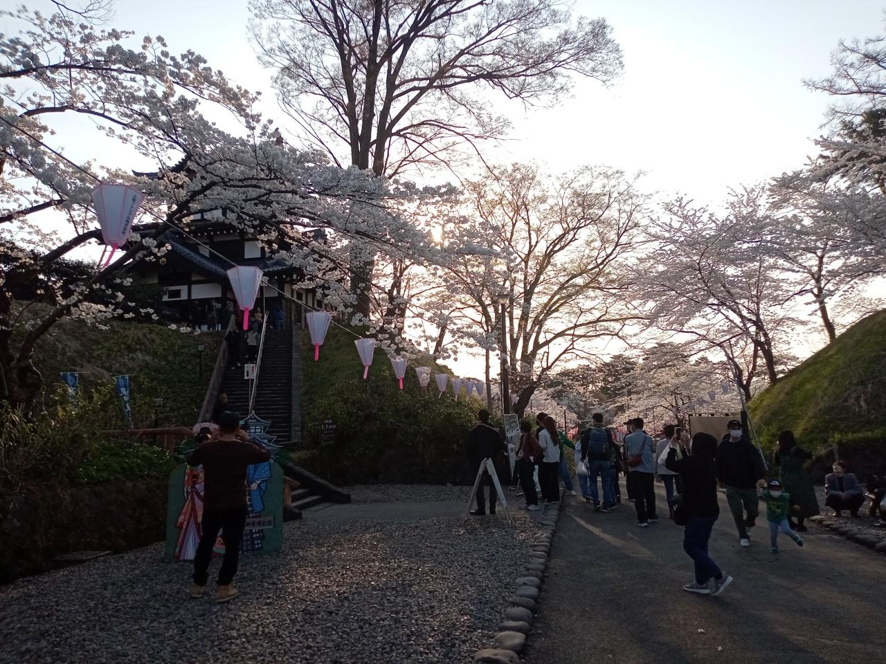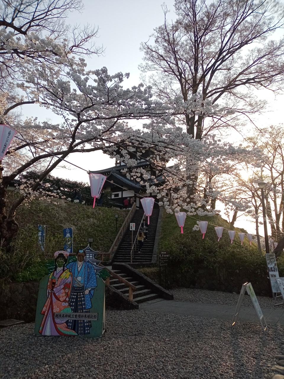 時刻は17時半過ぎ、この後も夕陽とライトアップの桜並木や三重櫓を見ます。続きは高田城址公園3へ。