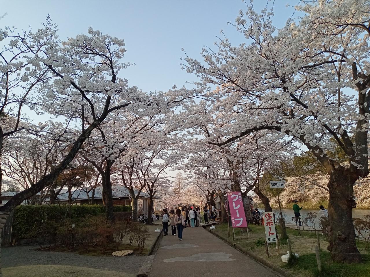 金曜日なので夕刻になって人が多くなっています。この全国でも屈指の桜の名所で、絶好の天気の桜が満開ならば訪れる人は多いでしょう。