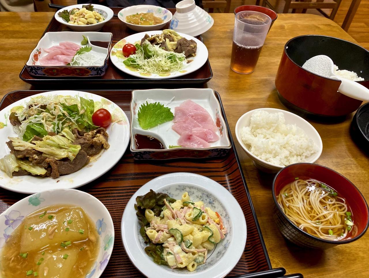 一階の奥にある厨房+台所に行くと、食堂になっており(他の宿泊客と一緒に=この時はほぼ工事現場のおじさんたち=)、本当に美味しいここの民宿のお父さんとお母さんの島の食材を使った手作り料理が頂ける。