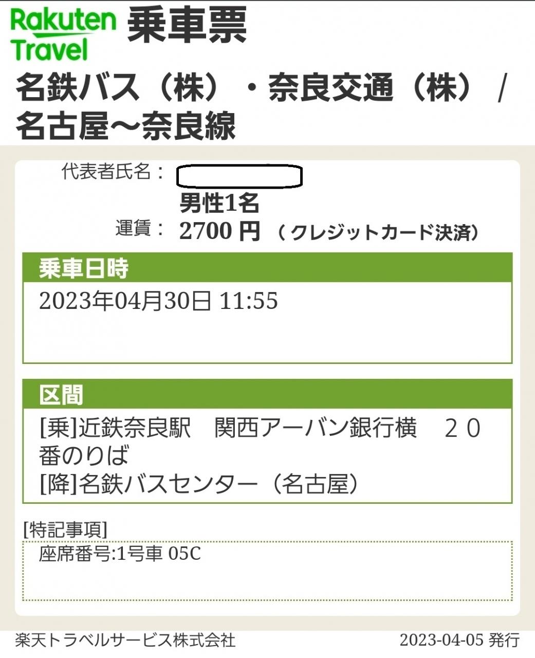今回は「名鉄バス」を利用します。事前に楽天トラベルにてチケット購入してました。片道:2,700円也。 -