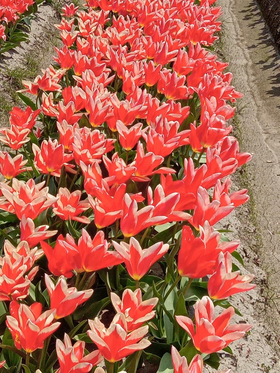 時刻は午前11時頃、桜並木からチューリップ畑に戻ります。空は依然ご覧のように雲一つない美しい青色です。