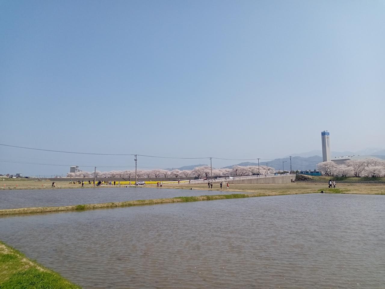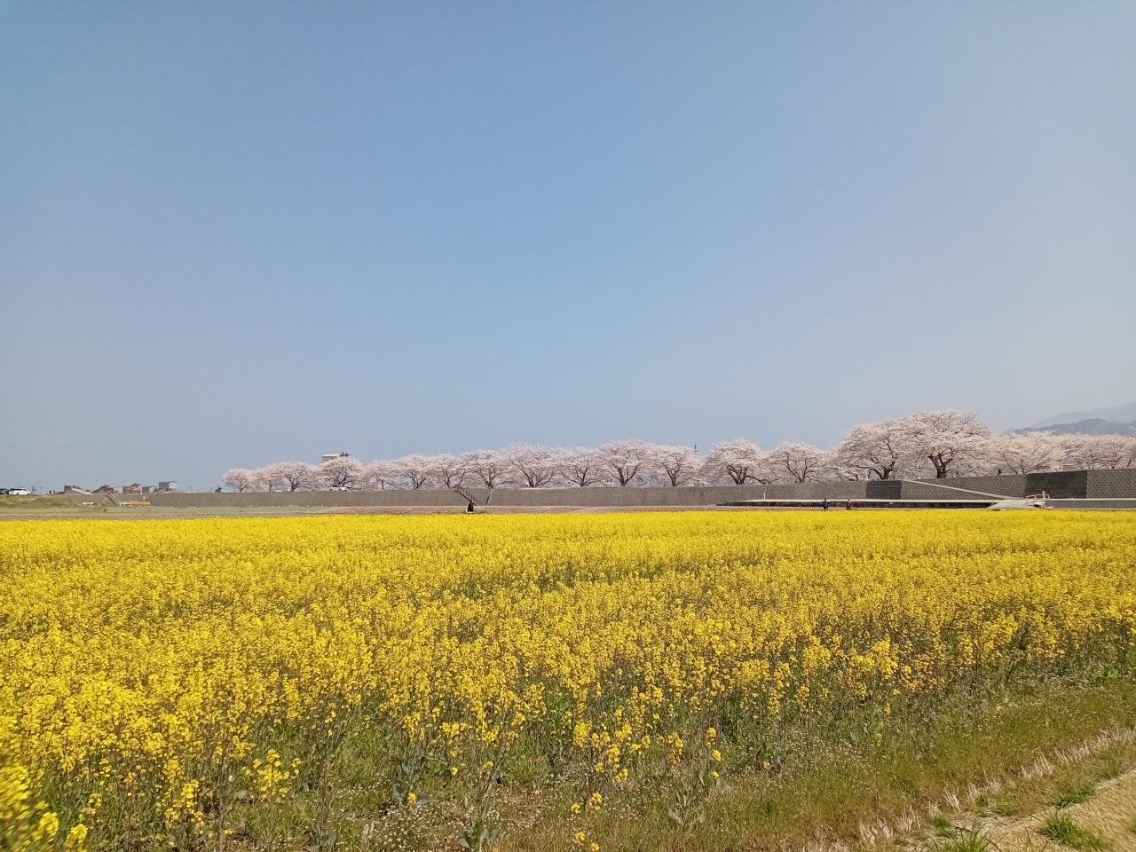 広大な菜の花畑ですね!そしてバックの桜並木も長距離に続いています!まさに絶景!絶句です!