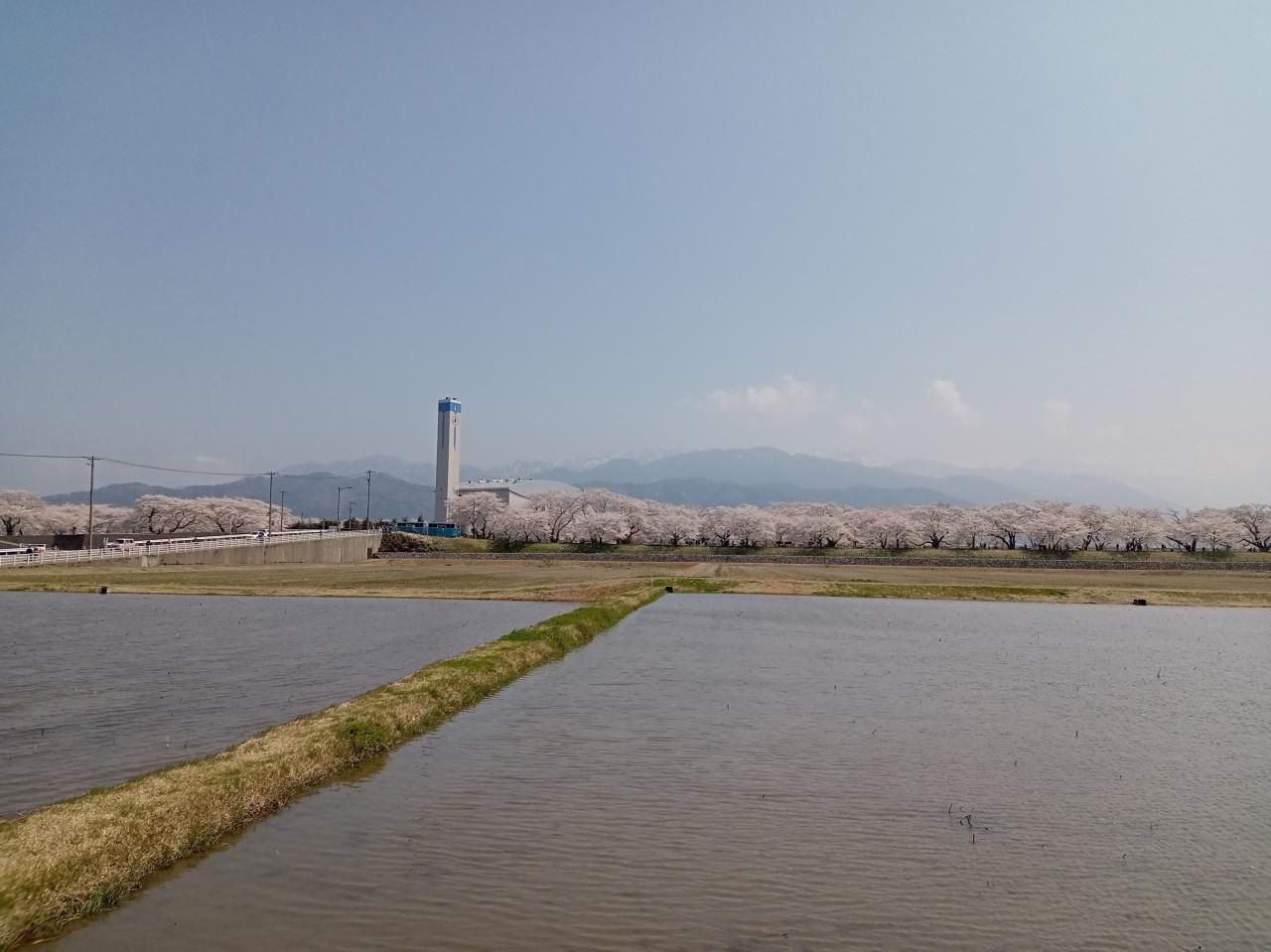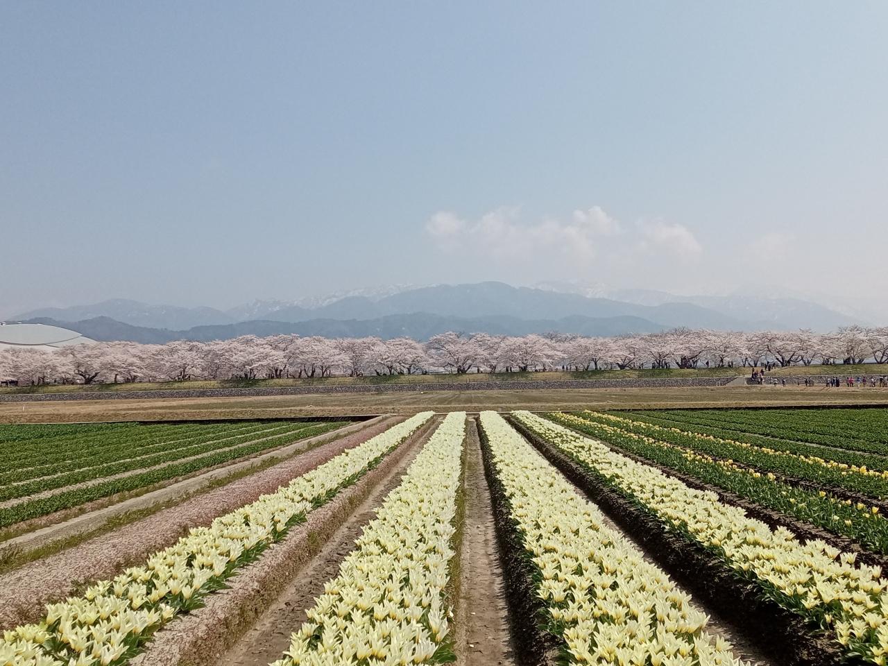 チューリップと桜並木のコラボを見るのは初めてですし、薄いながらも北アルプスの立山連峰も見えます!最近知ってここを訪れましたが、まさに大正解です!