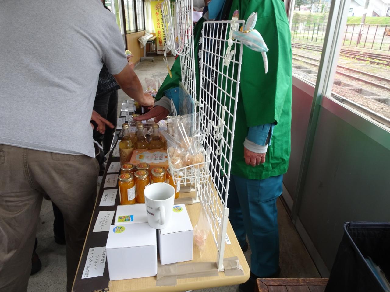 駅舎でおもてなし隊が、特産物などを販売しています。