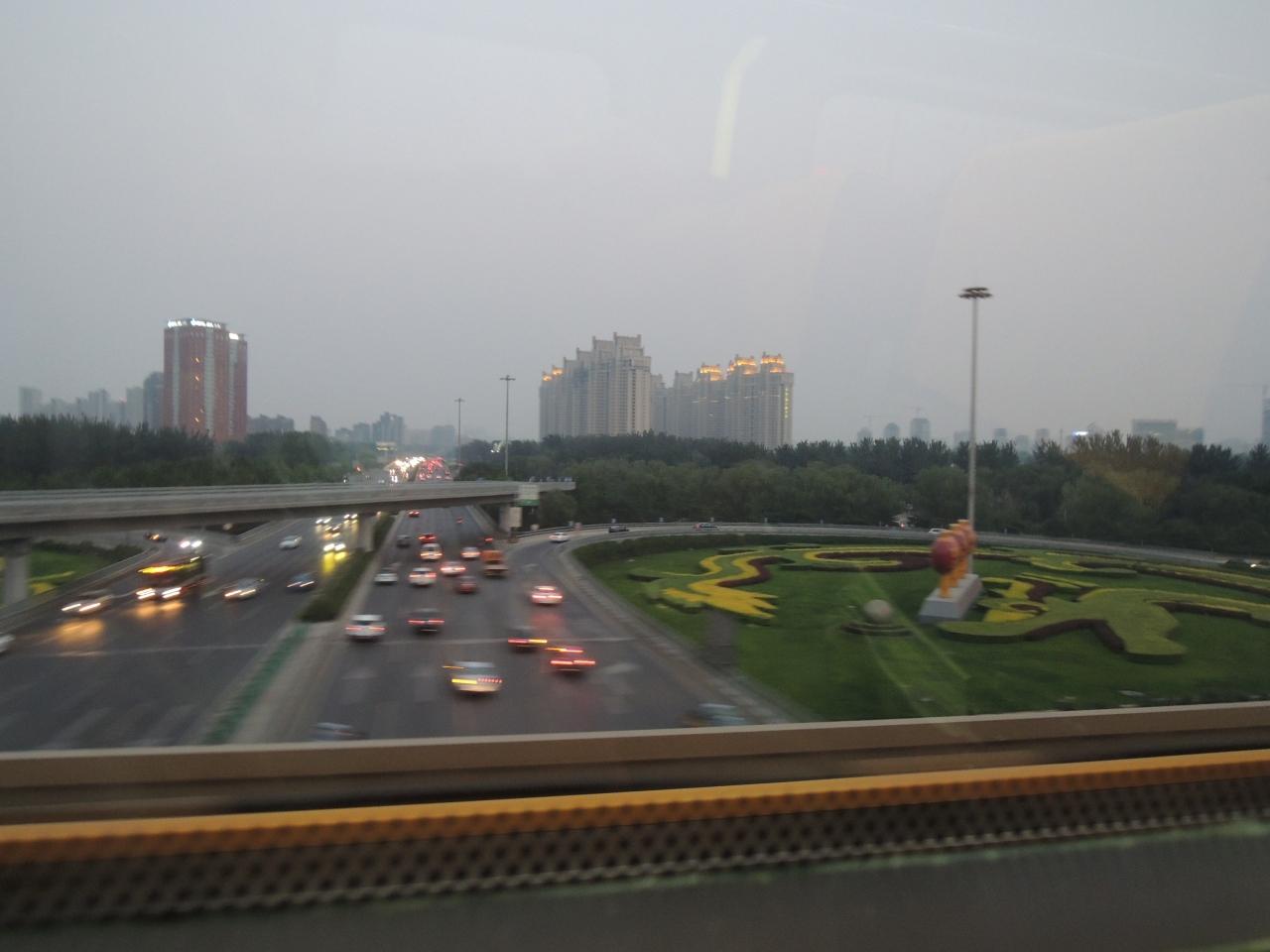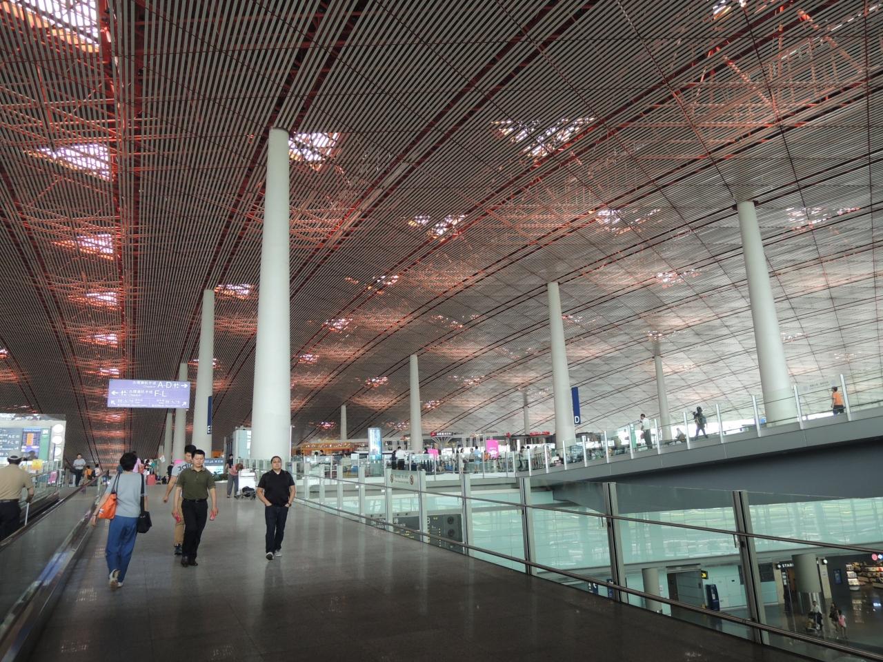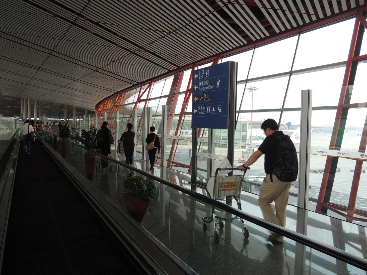 晴れているがスモックに覆われ地上は霞んでいる。やはり北京で青空は期待できないようだ。北京オリンピックを機に完成した巨大なターミナル3。遙か彼方のメインビルまで無人電車で移動して荷物を受けとることになる。