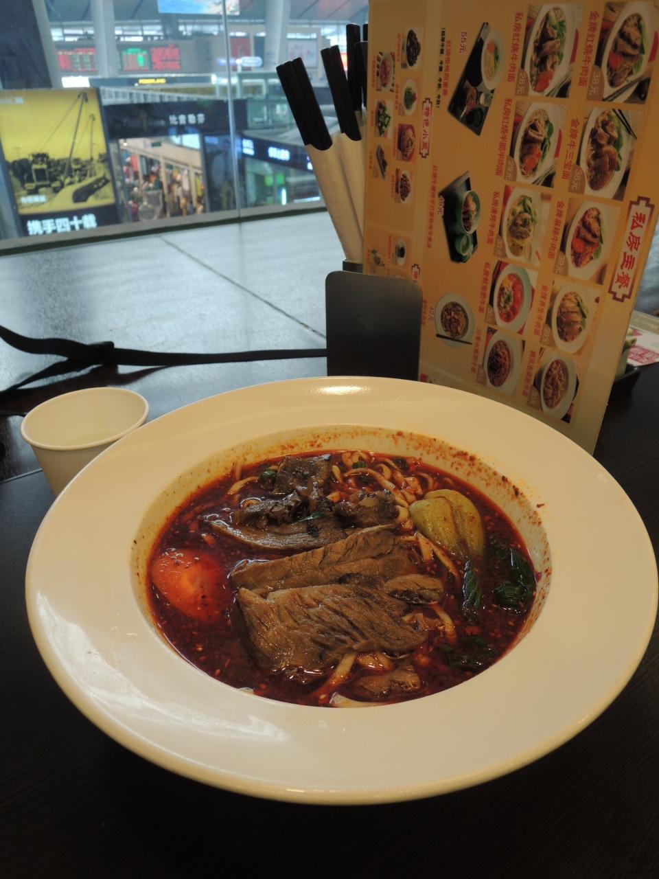 9時01分発の列車に乗り込むのだが、しばらく時間があるので駅構内のレストランで朝食として牛肉面を食べることにした。