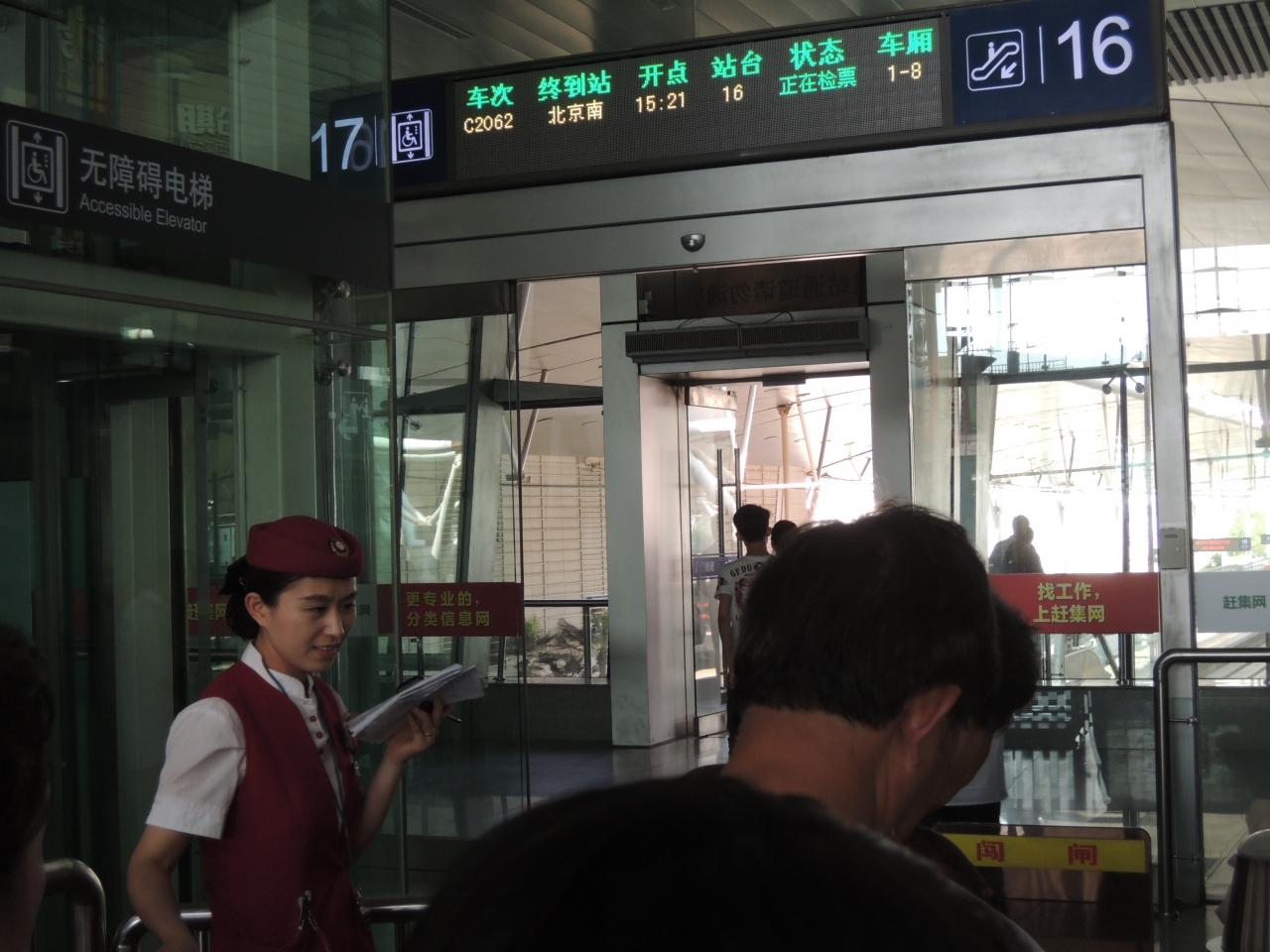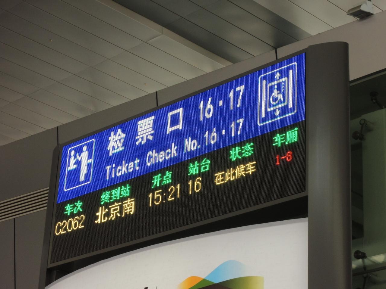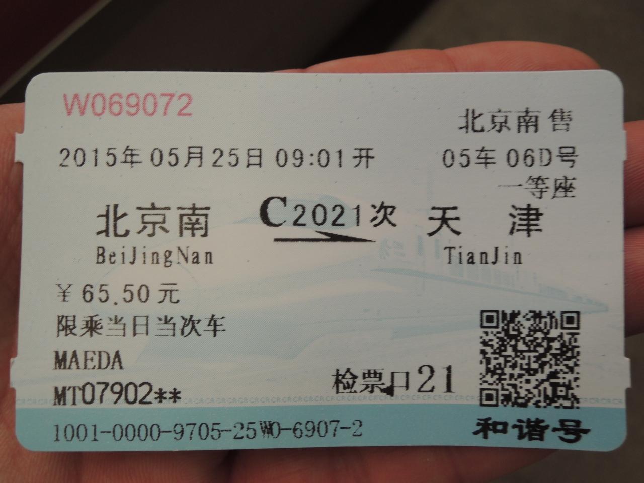 天津までの切符を購入することにした。天津までは頻繁に列車があるので事前の予約の必要はなく、1時間後に出発する列車を予約することができた。今回は一等を予約してみた。とはいえ天津までは所要35分だ。