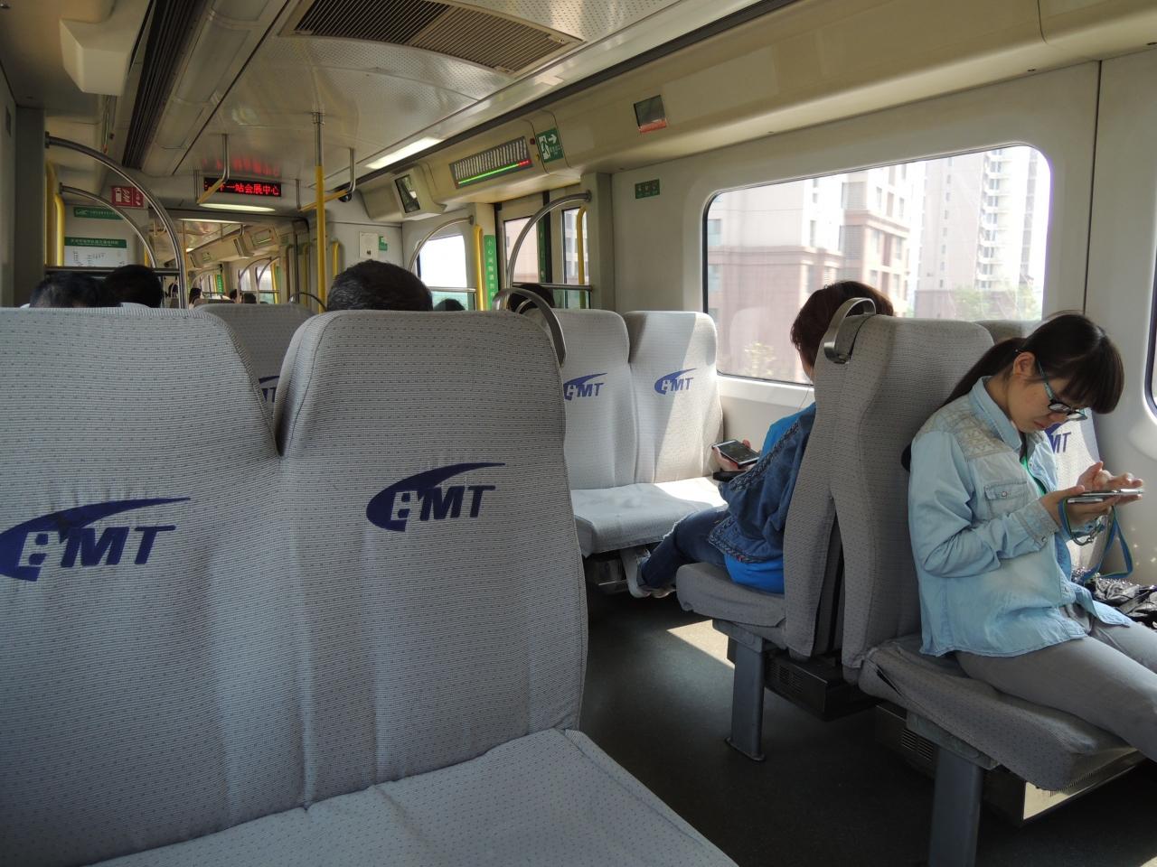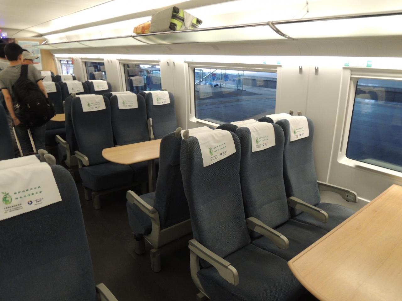 切符を購入後すぐに乗り場へ向かった。帰りは二等座席を予約した。値段は11元(200円)しか変わらないのでアーバンライナーのデラックスシートみたいな感じだ。所要時間は35分なので窮屈でも苦にはならない。乗り込んだのはビュッフェのある車両でテーブル付きの横5列の座席が配置されていた。本来なら食堂車として使用されるはずだったのが、座席車として利用されているようだ。