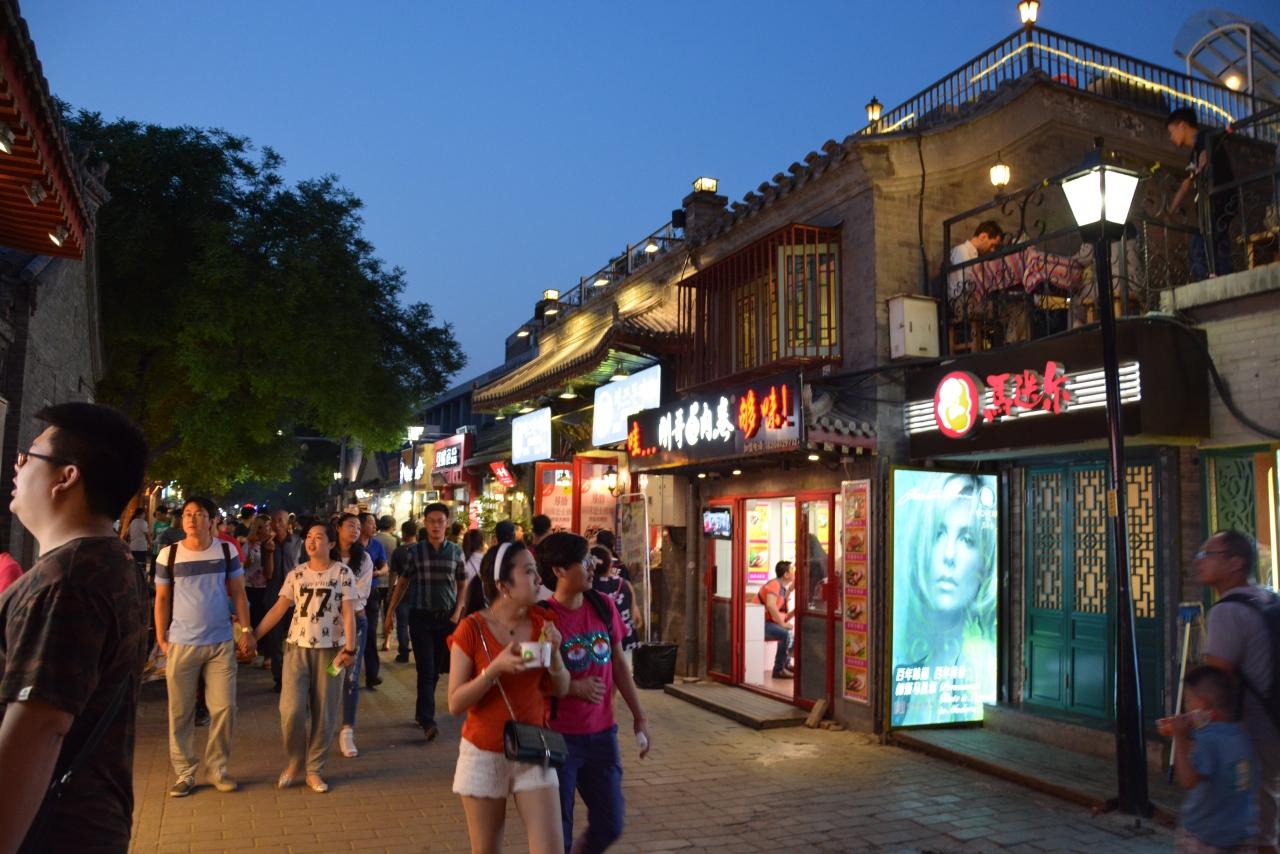 夕暮れの胡同。観光客が行き交う賑やかな通りもある。