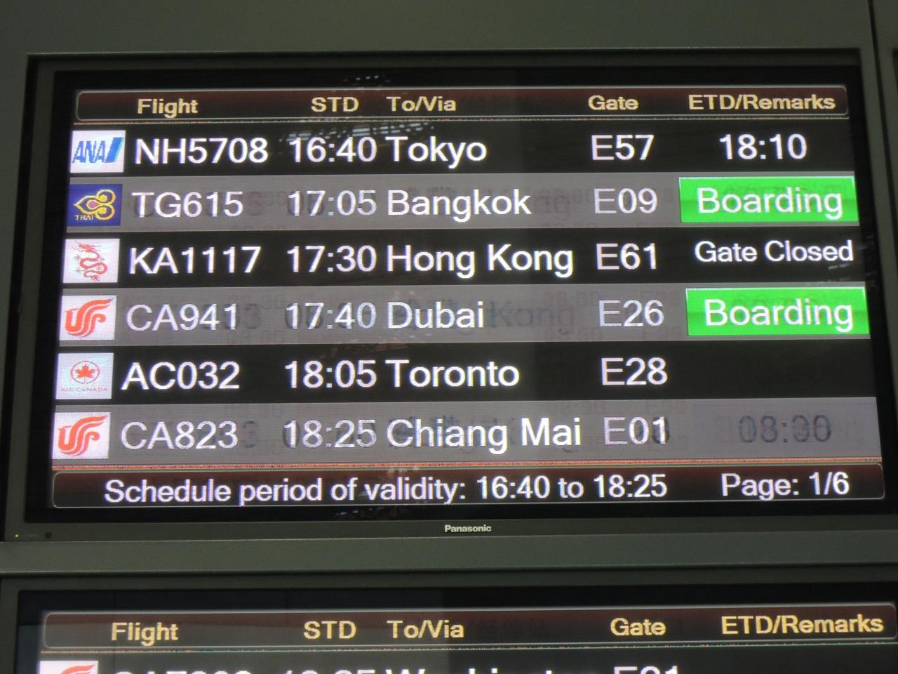 満腹の状態で搭乗口へ向かおうとしたら東京行きのフライトが90分の遅延と表示されていた。16時40分発の東京行きだが18時10分発になってしまった。成田空港の到着は21時なのでそれが22時30分着になってしまう。成田空港には23時までに着陸しなくてはならないがギリギリだ。