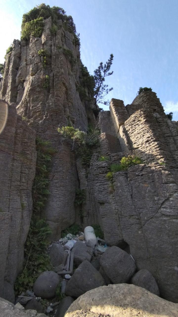 傾いた柱状節理の岩。