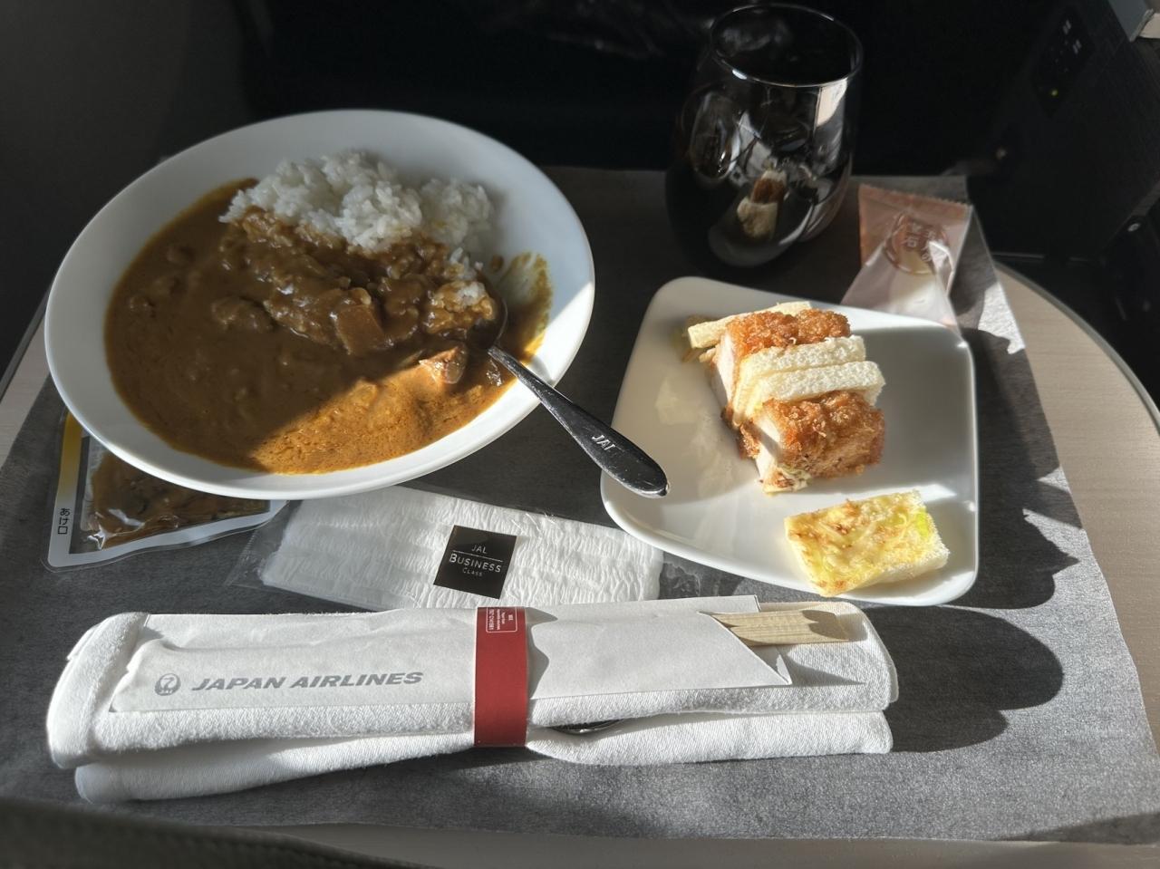ひと眠りしたあと、なんだかお腹が空いていました。一食めにステーキしか食べなかったからでしょう。到着までまだ8時間以上あることに気づき、アラカルトメニューから宮崎和牛カレーと三元豚カツサンドイッチを注文することにしました。