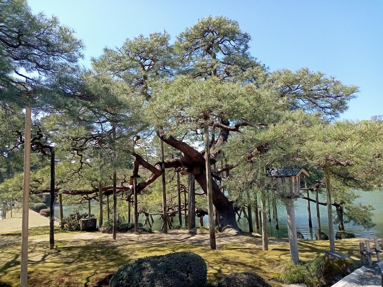 逆光気味ですが、巨大な唐崎松を近くで見ると異次元の美しさです!松の木が何本もの杭で支えられている光景は兼六園以外にあるのでしょうか!