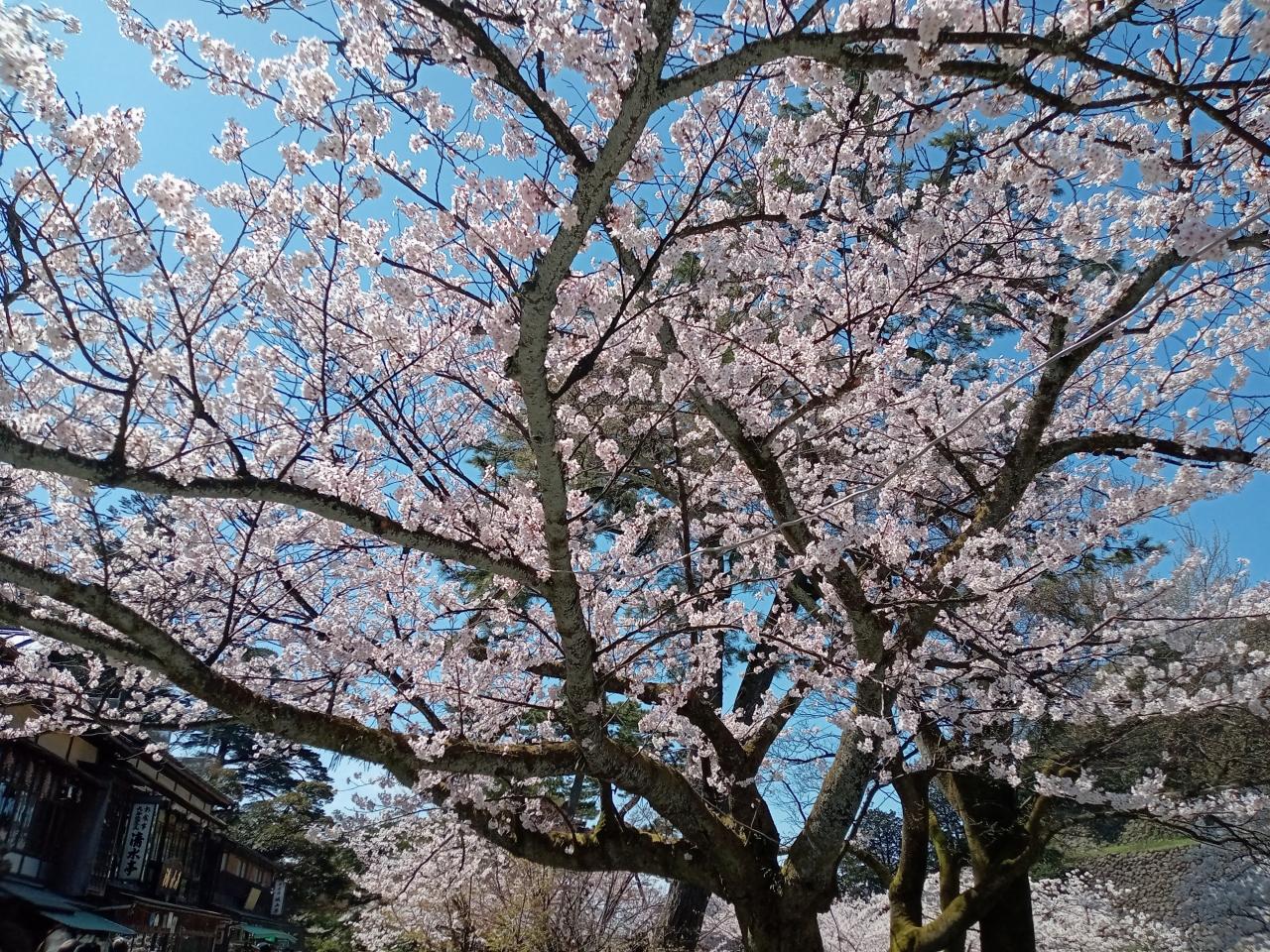 1本の桜を眺めても、一部ピークを過ぎている木もありますが、多くはまさに満開のピーク状態!青空の下、信じられないほどの美しさです!