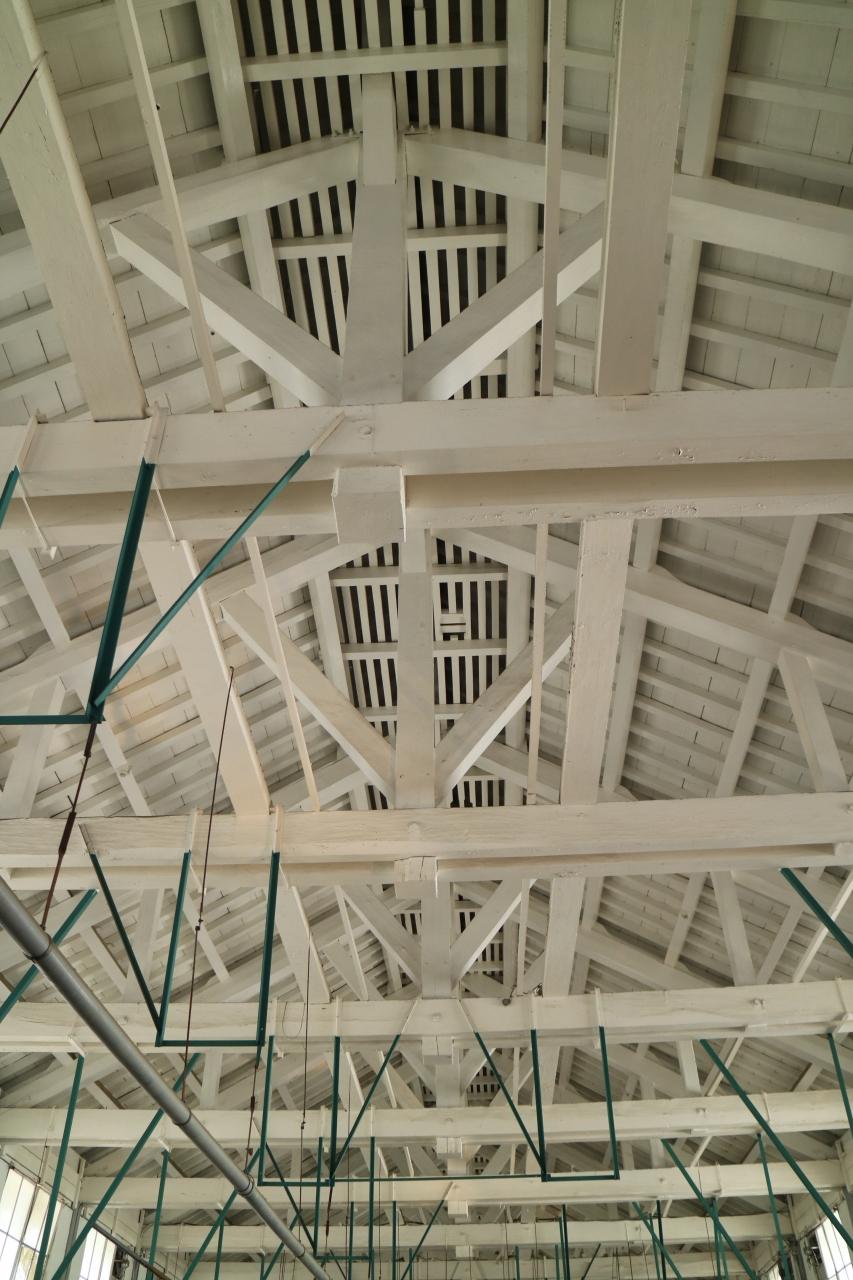 工場の天井部分の梁が美しく組まれている。