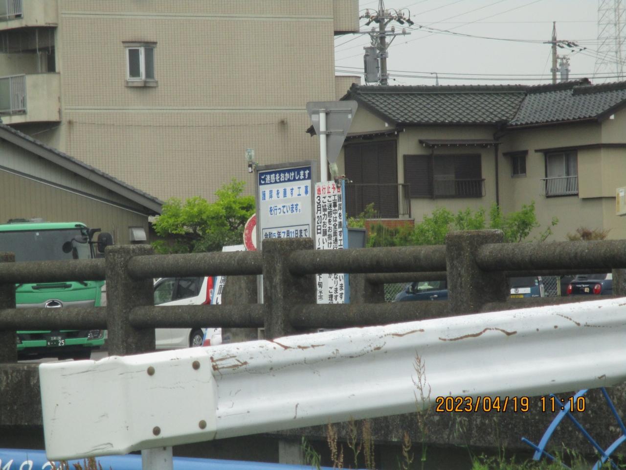 230419-1110.水曜。東海市富木島。きょうはこちらから産業道路に向かいます。護岸を直す工事を行っています。令和5年7月31日まで。