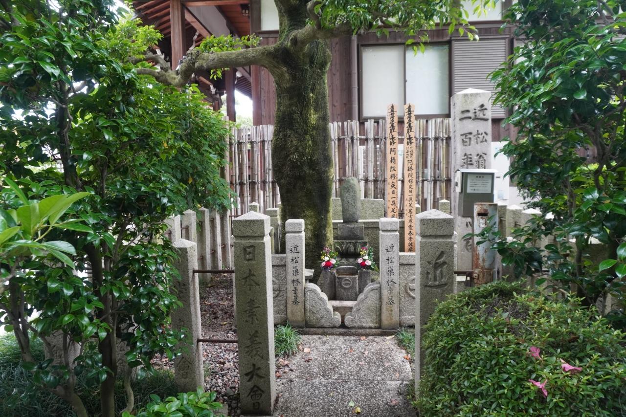 境内にある近松門左衛門墓はひっそりとしたものですが、やはり、そういう逸話があるだけにその価値は高い。