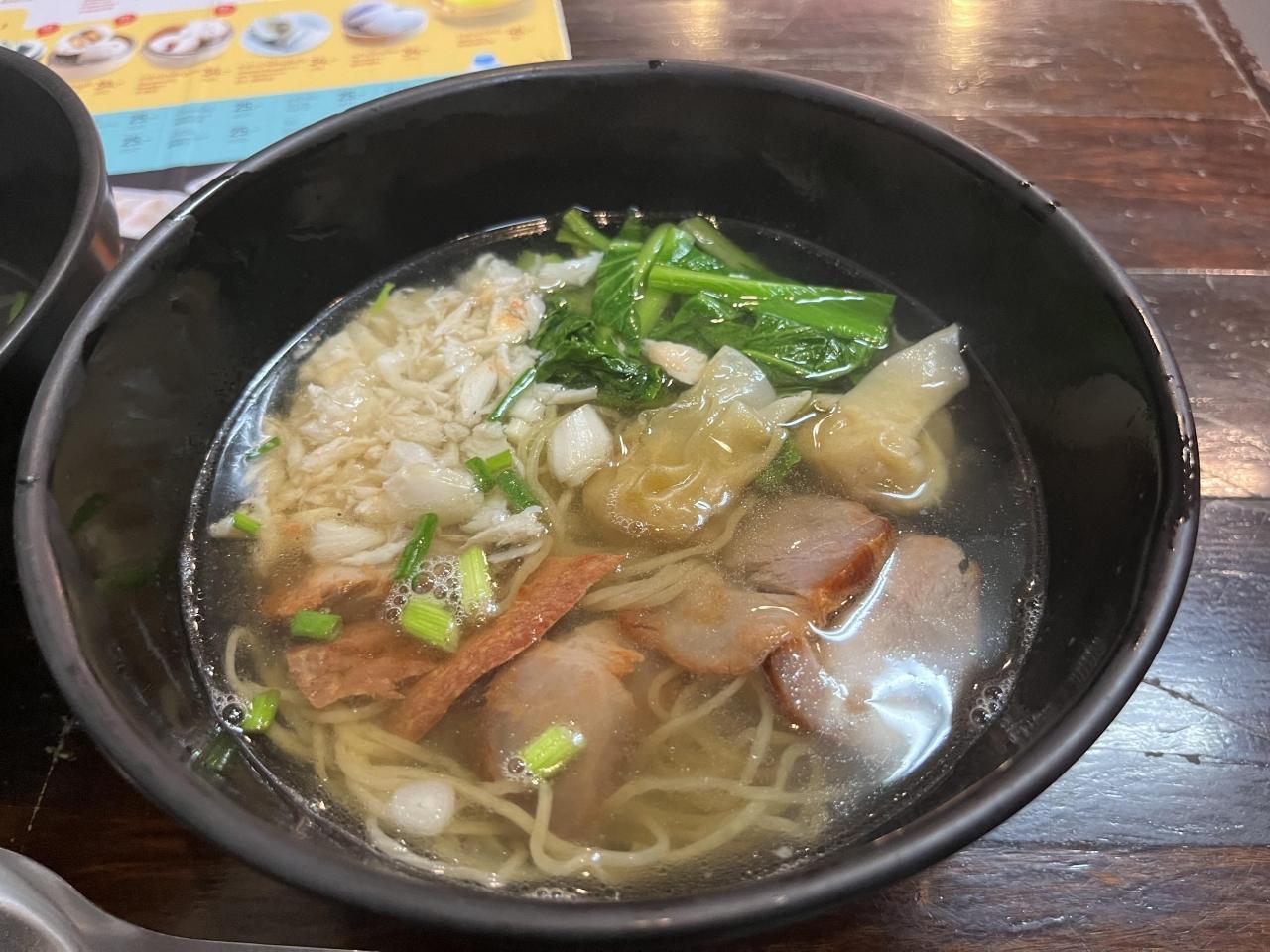 オーダーしたのはチャーシュー、エビワンタン、カニ身が入ったヌードル。115THB。
