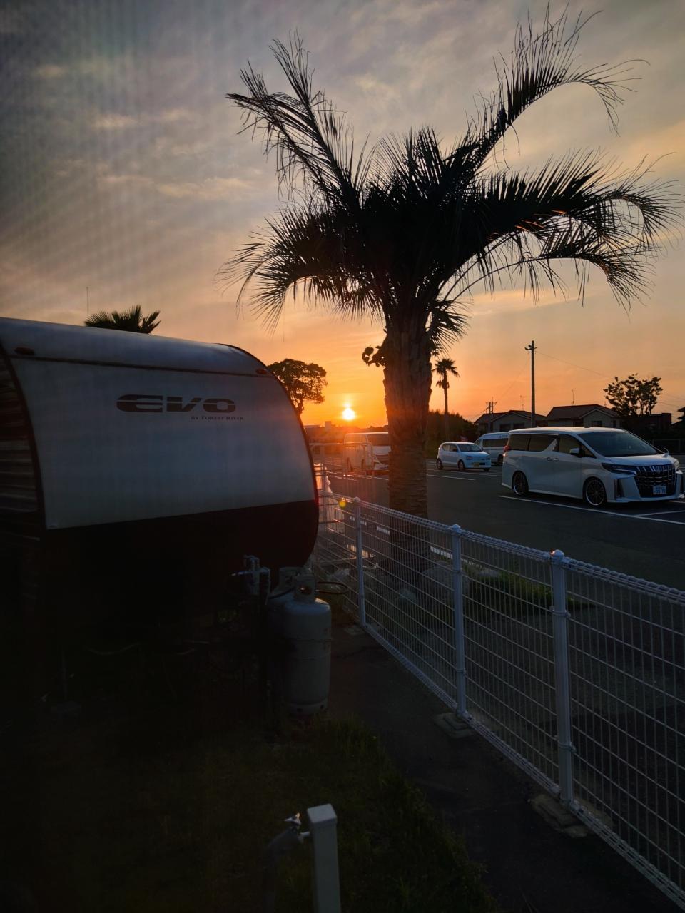キャンピングカーの窓からは、かろうじてきれいな夕日を見ることができました。