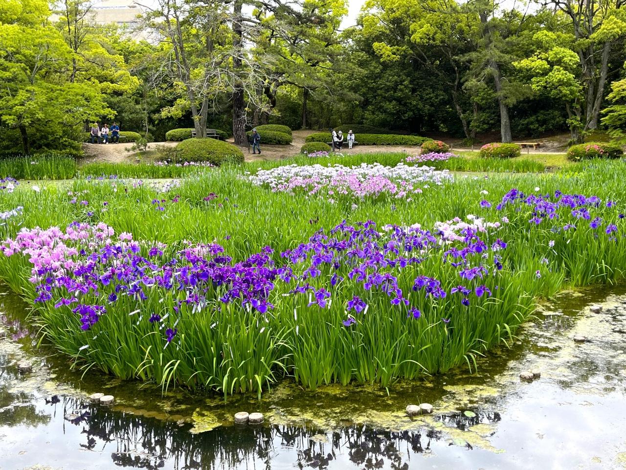 江戸時代は鴨猟に使われて園内最大の池。花しようぶが咲き始めていました。 -