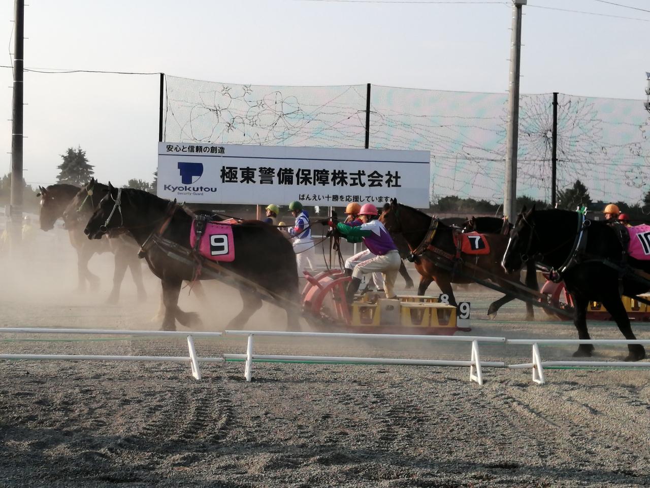 体重1トンを超える馬が重りをのせた鉄ソリを引いて直線コースを走ります。