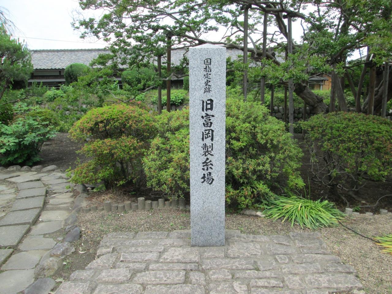 神水館を出発、富岡製糸場に到着。標柱が建つ。 明治政府が日本の近代化のために設立した官営製糸場で面積は54.000平方Mあり、世界遺産に登録されています。文化財として、国宝は東置繭所、西置繭所、繅糸所、国重文は鉄水溜、蒸気釜所、首長館、女工館、検査人館があります