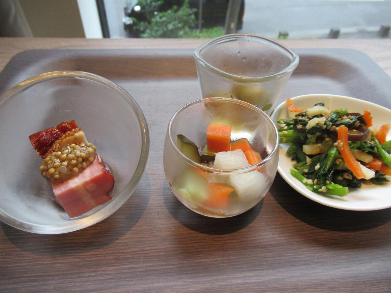 奥さんは、おばんざいセットで、ショーケースに並んだ小鉢から好みのものを6種類選ぶシステムです。