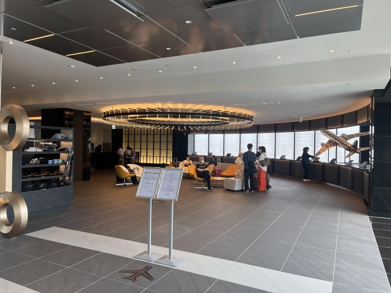 左奥にフロント、正面が椅子やテーブル、右から正面奥にはチェックイン機が並んでいます。 -