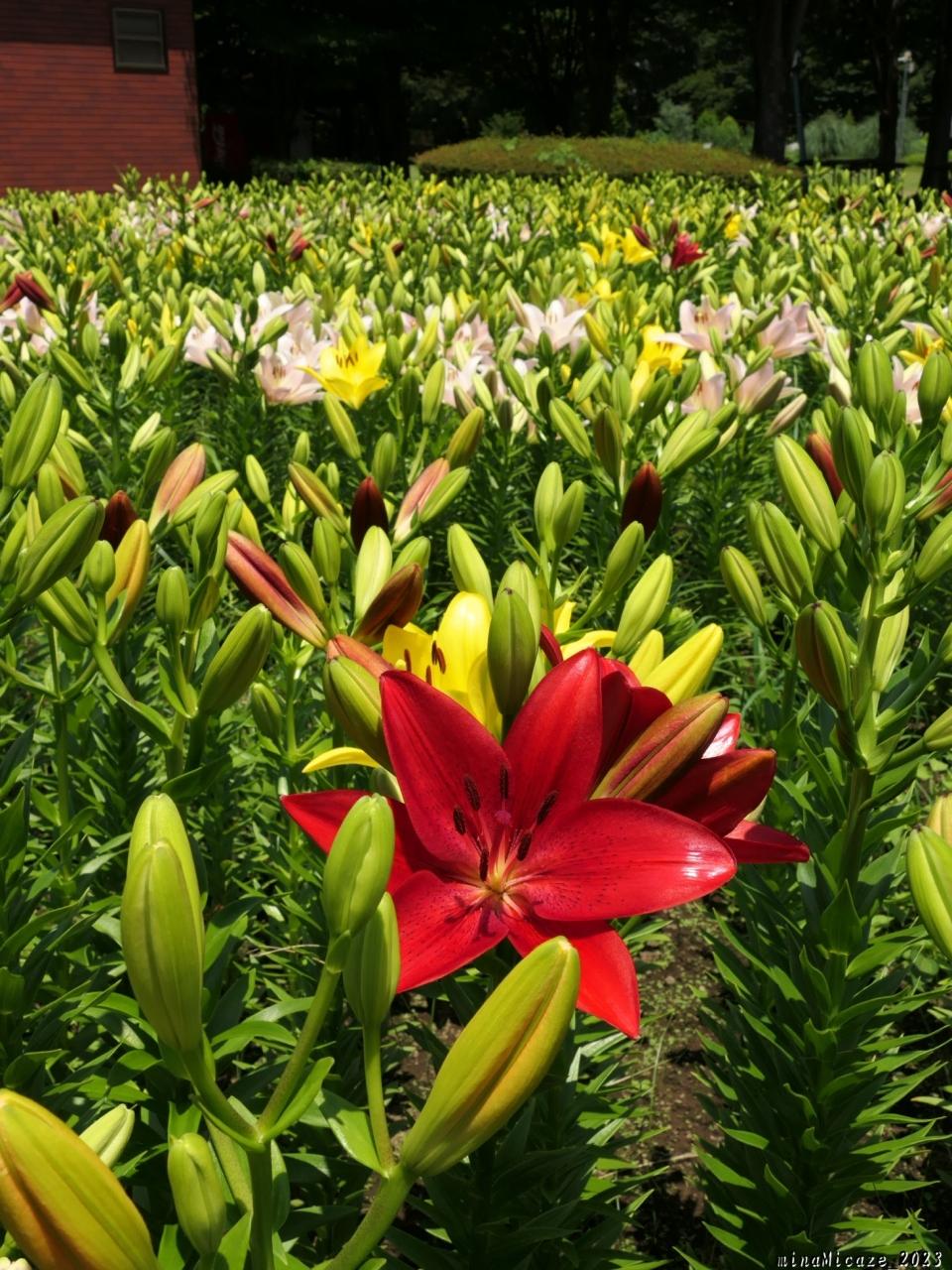 北東側から見たユリ畑です。赤やオレンジが咲かないと、華やかさがありませんね。