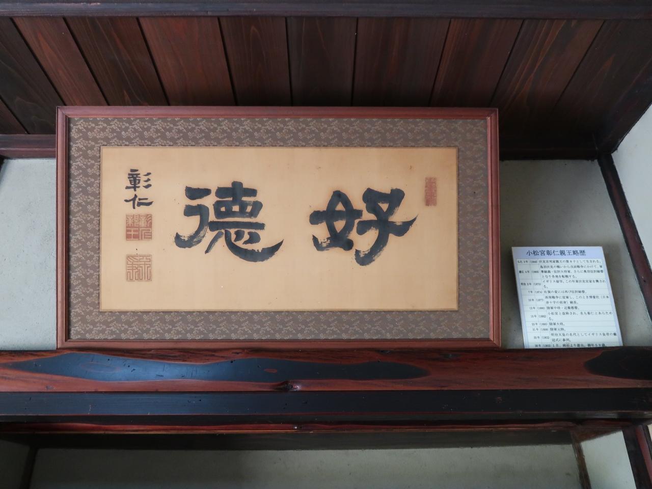 客間で目立っていたのは、小松宮彰仁親王の書。村上を攻めた奥羽征討軍の総督でした。どういうご縁でここに額があるのか・・・・ずっと軍人として働いた人らしく力強い字です。一方で夫婦で茶道に勤しんだり、日本赤十字社の創設に関わったり、明治天皇名代で諸外国に行ったりと活動的な人だったようです。