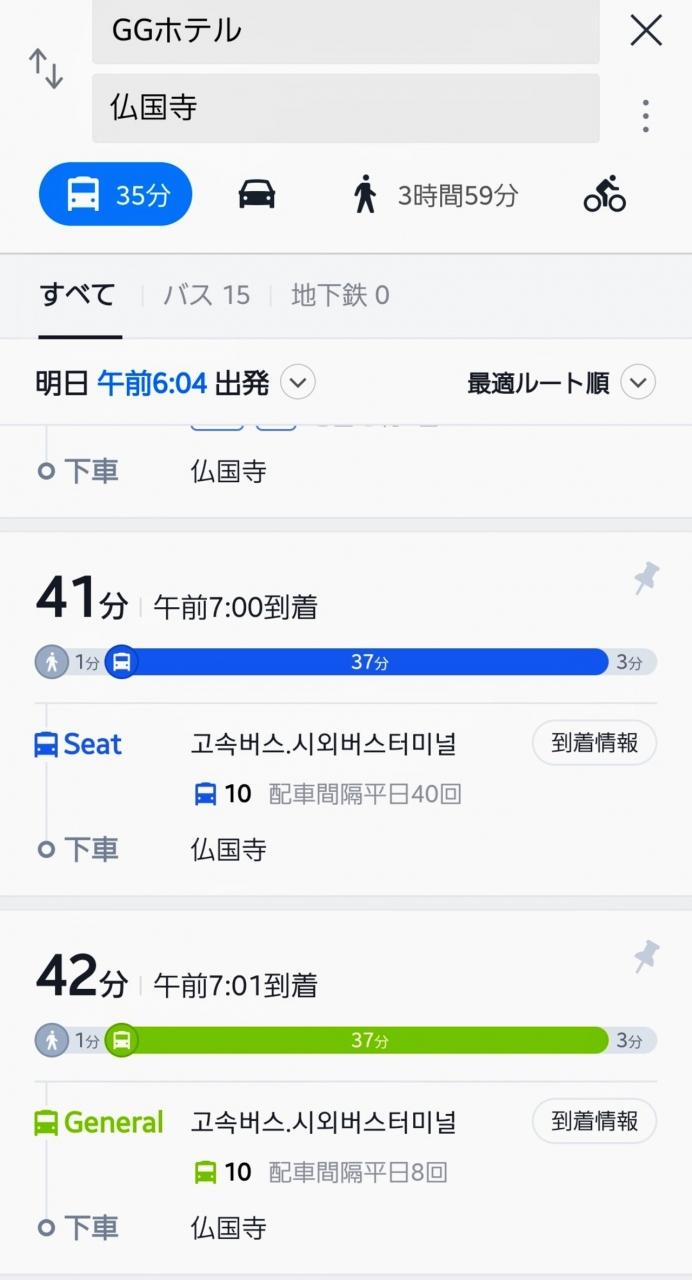 韓国ではグーグルマップが正確に出ないことがあるので、NAVERマップでバスの時間を調べるとわかりやすいです。