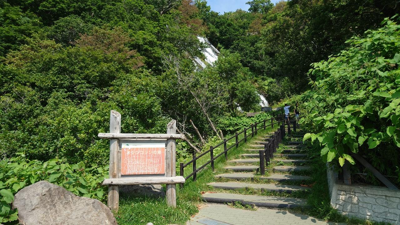 羅臼から知床峠を越えてウトロへ、乙女の涙は熊出没のため8/4まで滝へ行けない。オシンコシンの滝でマイナスイオンを浴びて、天に登る道を走って浜佐呂間まで。
