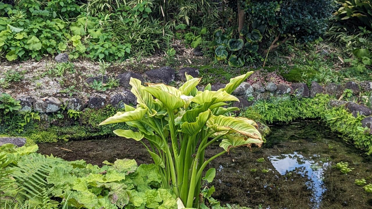 分かりにくいですが、こちらの池でも鯉たちは岩の下に退避してます。