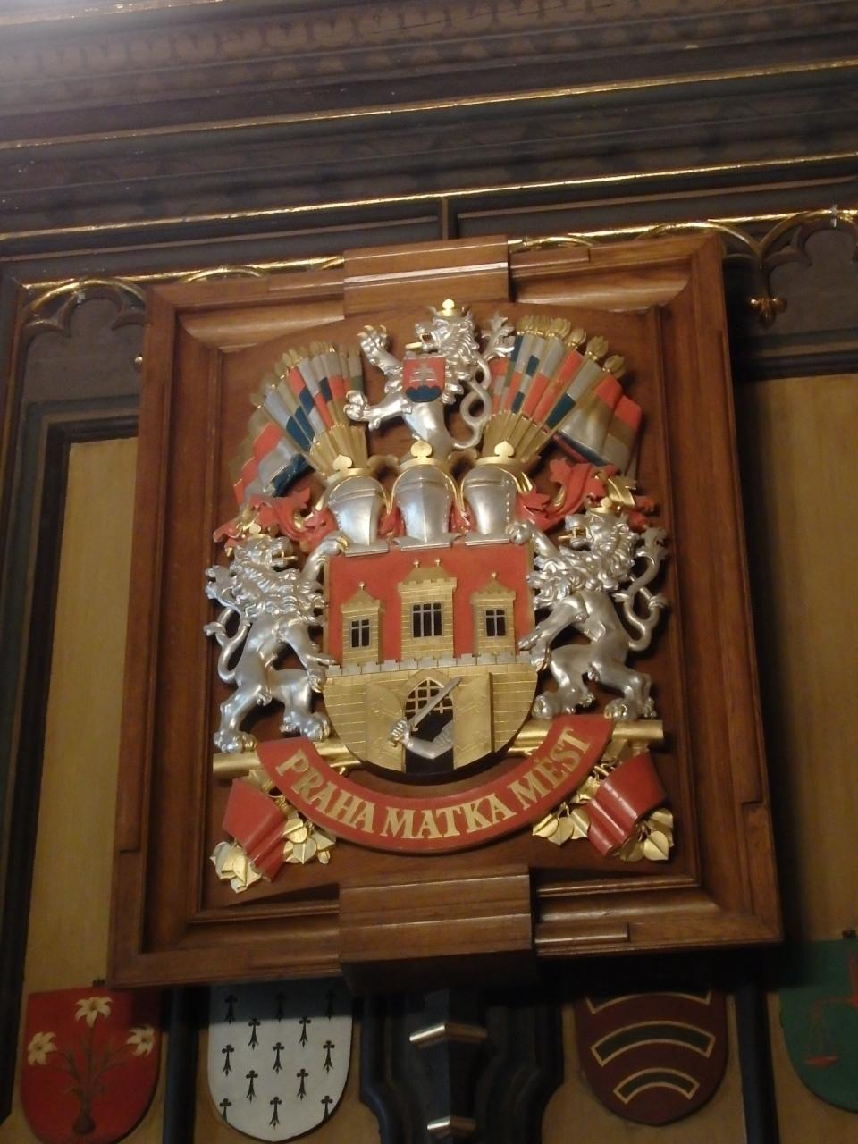 ここは「市民ホール」で、プラハの紋章が描かれたタペストリーが飾られています。ホールの内装は1945年の空爆で被害を受け、その時に全て改装されたとのこと。 -