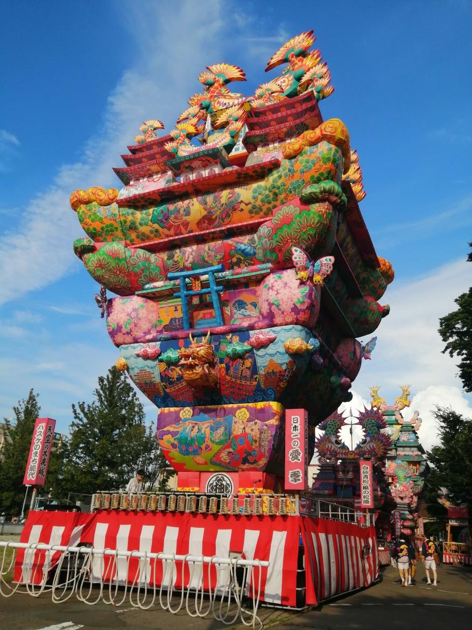 この日行われる天空の不夜城の山車が展示されていました。後で知ったのですが天空の不夜城で使用される大型の山車が7/31から市役所駐車場にライトアップして展示されていたようです。前日に見に行けばよかったです。