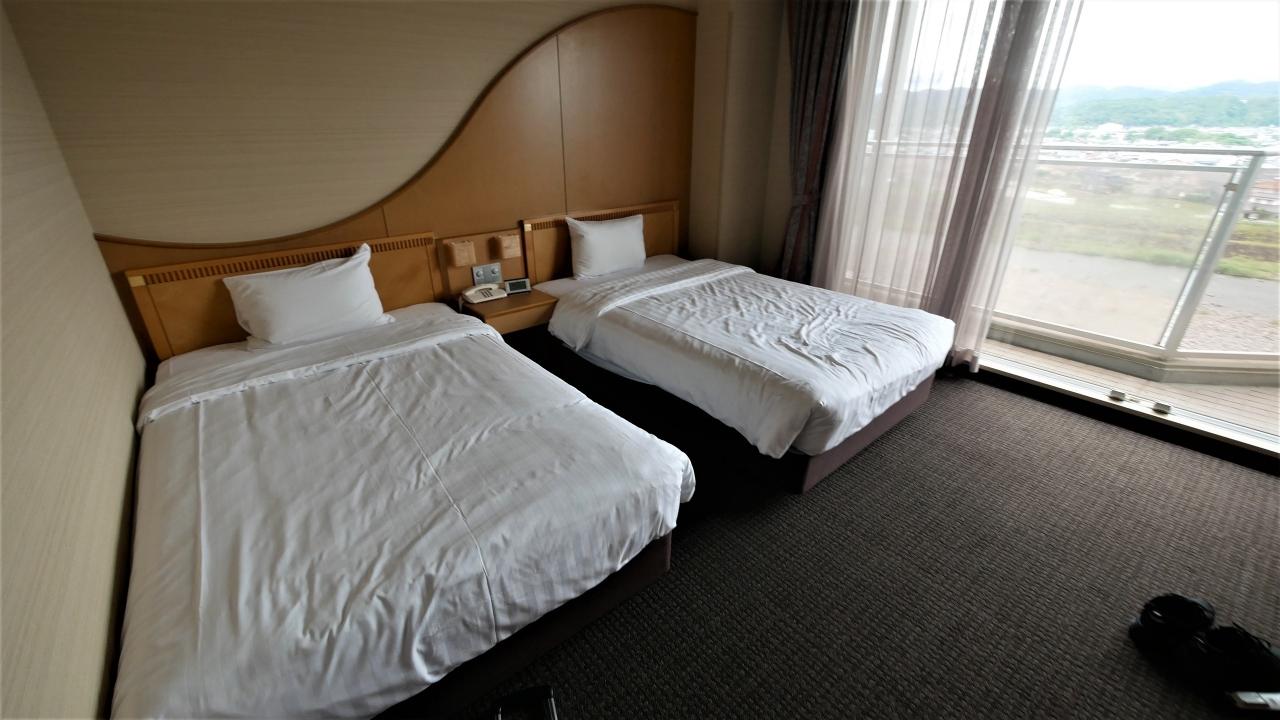 6/11 1550 日田天領水の宿に着く 三隅川の中州にある.洪水は大丈夫なのかなとちょっと心配 部屋は洋室だが小さな段差のあるスペースがある.ツインのシングルユース 一泊2食付きで15550円と安い 部屋からは三隅川をよく展望 大浴場にはミストサウナがる.残念ながら本当のサウナはなかったと思う.(忘れた).食事は夕食朝食ともこの料金としては,種類も豊富でよかった.泊まっていいホテルだ.