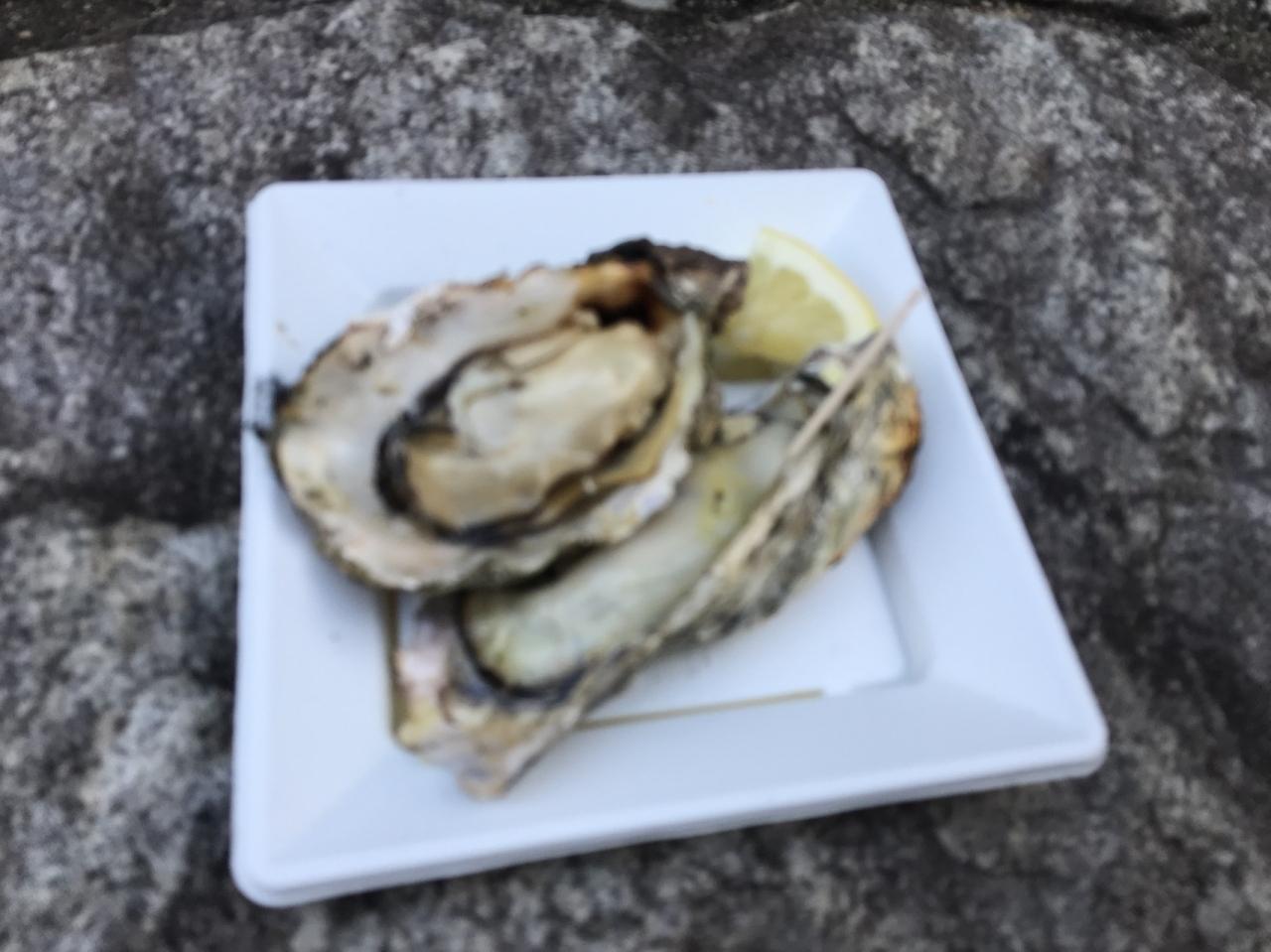 醤油で味付けされた身が大きいカキにレモン汁をかける。磯の香りがしてありあっさりとしクリーミーな牡蠣は、食べごたえがあり美味しい。1皿2個で500円。 -
