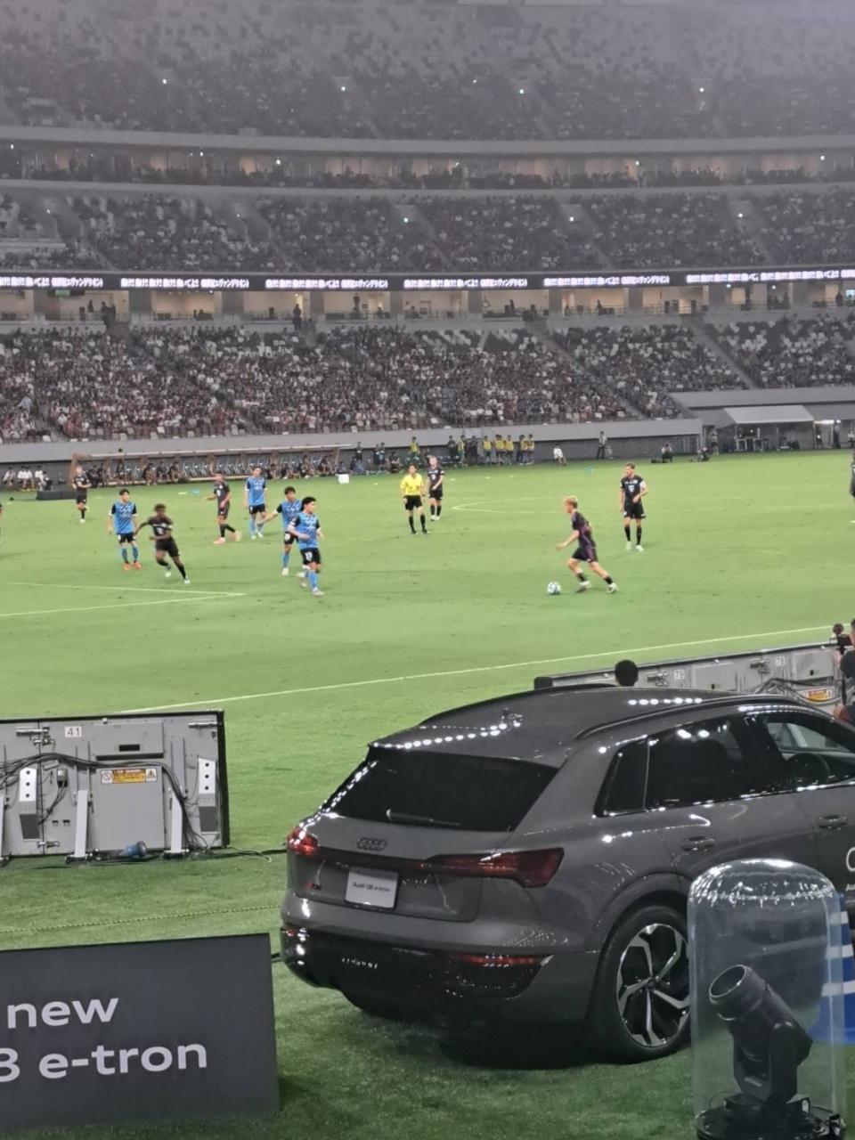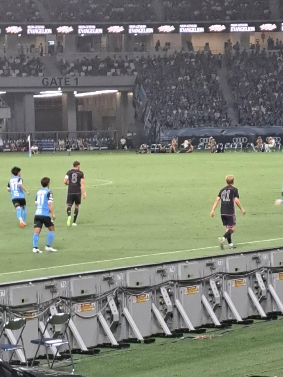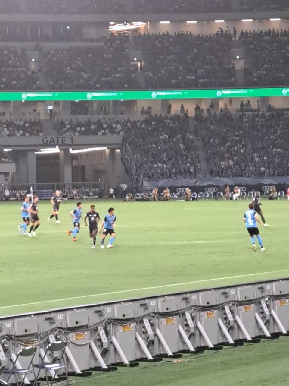 ハーフタイムを挟み後半に入りますが、後半出場選手のコマン、デリフト、ウパメカノ、ゴレツカなどが練習している姿が見え、主力ながら本日はベンチスタートの選手を生で見れた喜びと後半からの登場にワクワクが募ってきました。後半開始前もスタジアムが暗転して、普段アリアンツアリーナで流れる曲で盛り上がりながら、後半を迎えました。後半も川崎フロンターレが攻めるシーンも多々ありましたが、デリフト ウパメカノのセンターバックコンビで完璧に抑えれれました。中盤のゴレツカを中心にサイドからコマンの高速ドリブル突破など流石というプレーを見せてくれました。