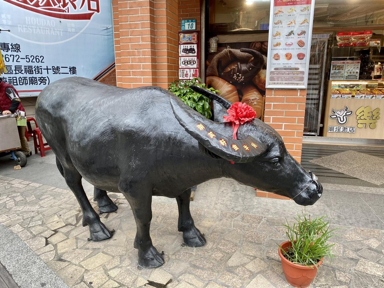 三峽老街前、「清水厳祖師廟」脇の黒牛オブジェを横目に通り過ぎ