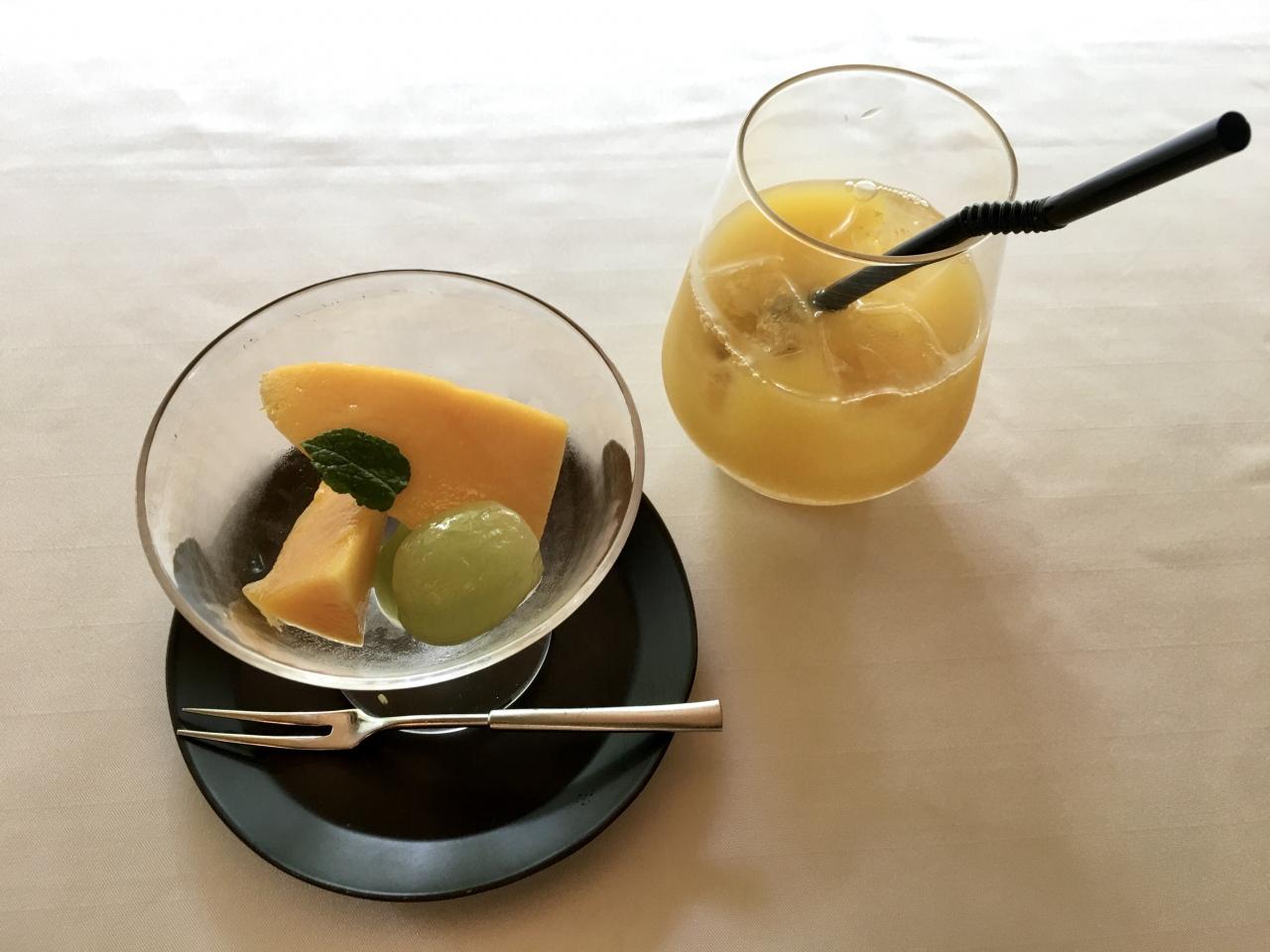 最後にフルーツ(マンゴー,パイナップル,マスカット)とオレンジジュースを。コーヒー,紅茶もいただけます。