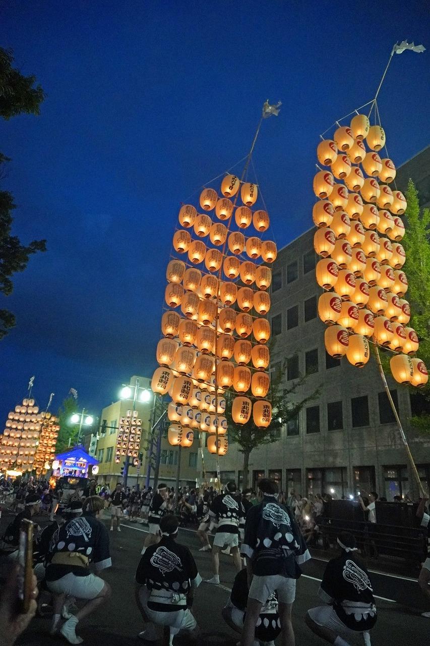 夕暮れ前のこの時間帯は提灯に灯った蠟燭の明かりがとてもきれいです。御幣が地面に着かないように掲げられた姿も勇ましいです。竿燈まつり終了後の8月7日に各町内・企業の代表が刈穂橋(馬口労町通り)に集まり、真夏の邪気や睡魔と共にこの御幣は一斉に旭川に流す「御幣流し」という行事もあるようです。