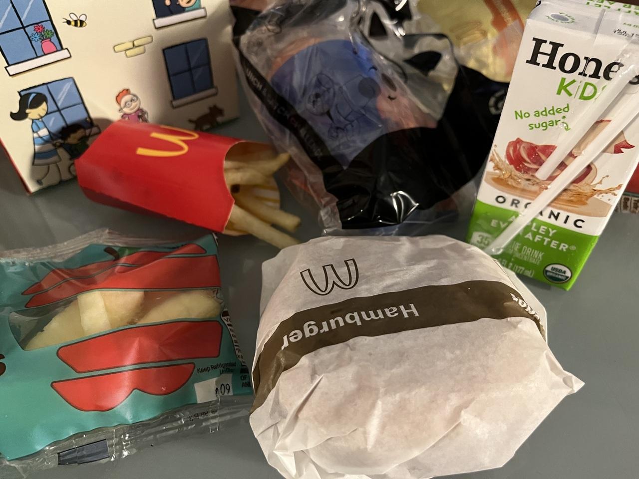 めちゃウインクしてくる店員さん、ビッグマック買ったらもう一つついてきたビッグマック、子供用の甘くないオーガニックアップルジュース等、日本との違いを感じます -