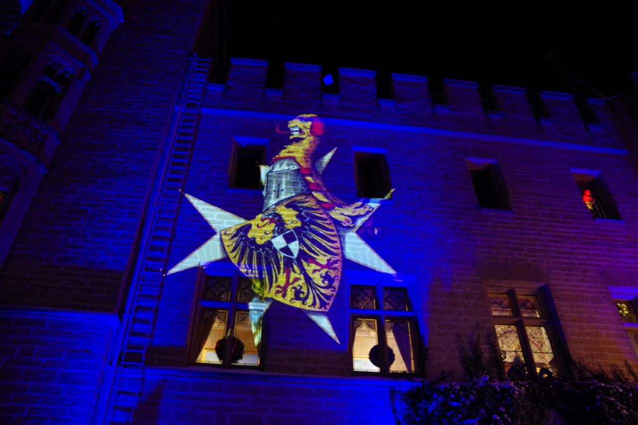 城の中庭では、一定の間隔を置いて、建物の外壁にプロジェクションマッピングが行われています。絶えず動く映像なので、撮影はちょっと難しいのですが、ご辛抱願います。
