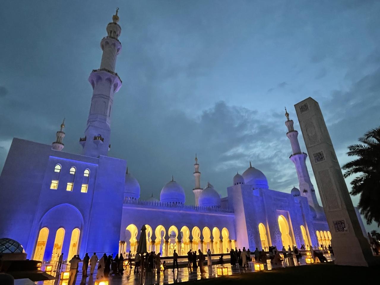 一服したあとは、またシェイクザイードグランドモスクに行きます。この日の日没は午後7時。時間を見計らってオンラインで予約をとります。またタクシーで向かいます。夕暮れのグランドモスクも美しい。