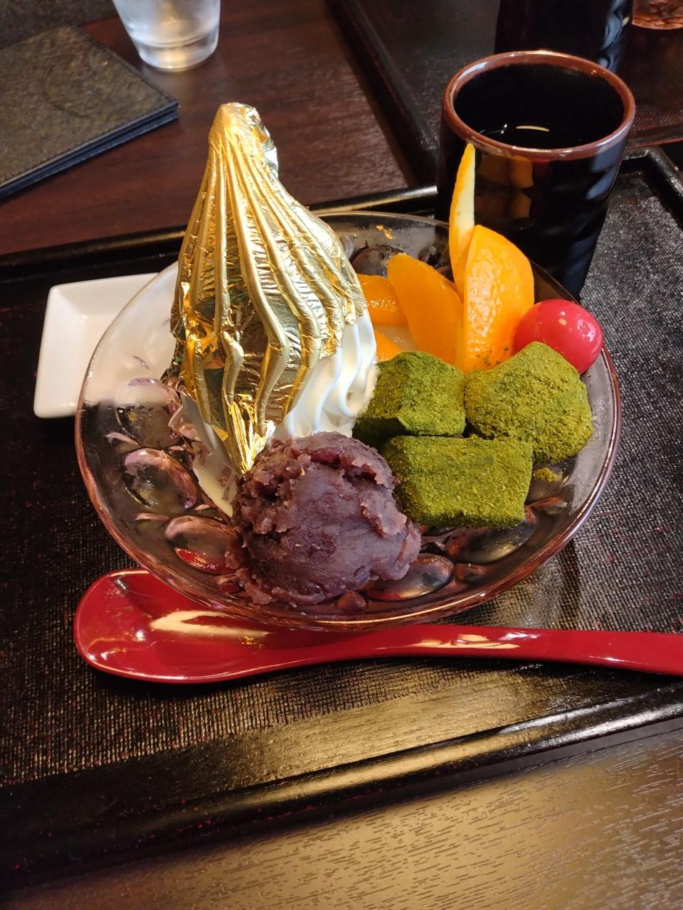 頼んだのが金箔ソフト付きのクリームあんみつ。