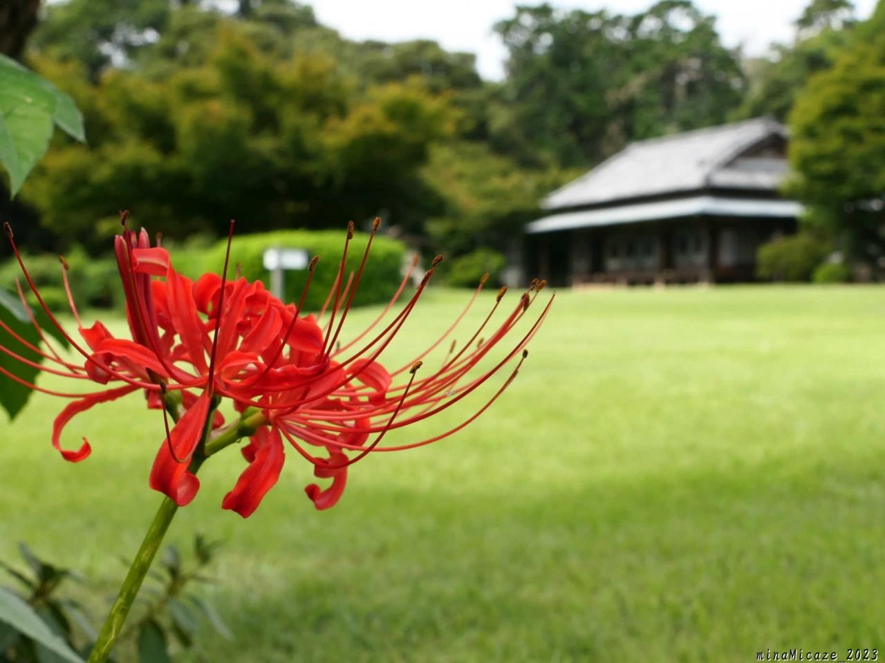 公園に入ってすぐ右側、「旧秋元別邸」の北側に咲き始めた彼岸花です。