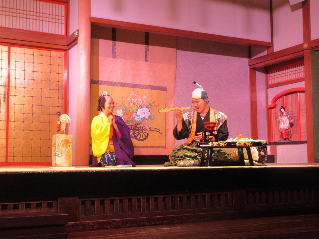 この劇場では、お客さんを劇の中に参加させる嗜好が施されていてとても面白いと思いました。左側の男性は忍者の格好をしていますが、鑑賞しようとしているお客さんの1人です。この劇に挙手をして参加することになりました。